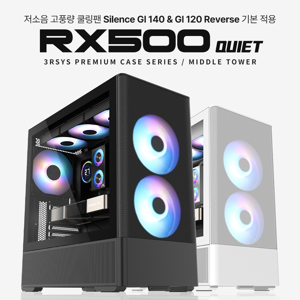 PC케이스(ATX) / 미들타워 / 파워미포함 / 표준-ATX / M-ATX / 표준-ITX / 쿨링팬: 총4개 / LED팬: 4개 / 전면 패널 타입: 강화유리 / 측면: 강화유리 / 후면: 120mm LED x1 / 내부 측면: 120mm LED x3 / 너비(W): 210mm / 깊이(D): 432mm / 높이(H): 465mm / 파워 장착 길이: 210mm / 파워 위치: 하단후면 / VGA 장착 길이: 410mm / CPU쿨러 장착높이: 165mm / LED 색상: ARGB62,500원62,500원