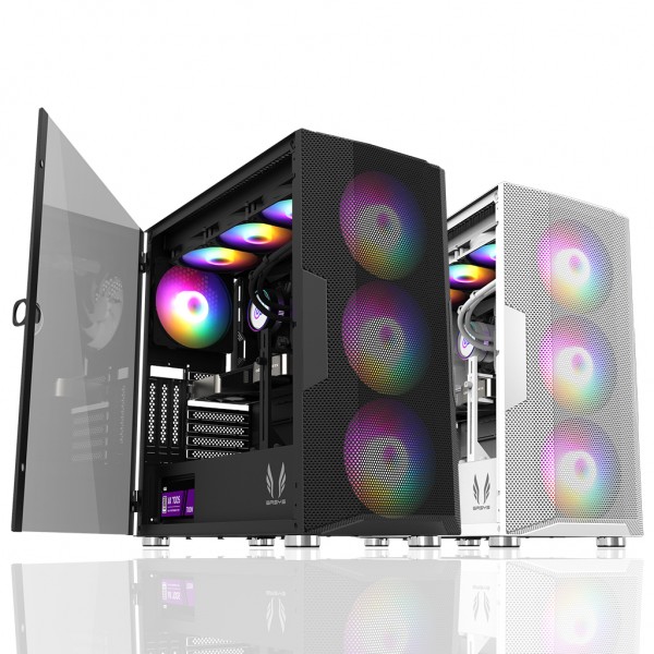 ATX 케이스 / 지원보드규격 : ATX , M-ATX , ITX / VGA 길이 : 400mm / CPU쿨러 높이 : 177mm / 미들타워 / 파워미포함 / [패널] 전면 패널 타입 : 메쉬 / 측면 패널 타입 : 강화유리 / [쿨러/튜닝] 쿨링팬 : 총5개 / LED팬 : 5개 / 후면 : 140mm LED x1 / 전면 : 140mm LED x2 / 하단 : 120mm LED x2 / [크기] 너비(W) : 225mm / 깊이(D) : 434mm / 높이(H) : 464mm / [호환성] 파워 장착 길이 : 160mm / 파워 위치 : 전면 / [부가기능] LED 색상 : ARGB