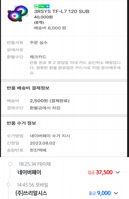 3RSYS TF-L7 120 SUB를 4만원에 구입하였고 반품하였습니다.환불금으로 2,500원 환불금에서 차감되어 3만7천5백원 환불 받았습니다.이렇게하면 계산 끝난건데 왜 알샵측에서 두번 전화가 와서 9천원 반품 택배비를 추가로 입금하지 않으면 환불이 되지 않는다고 하여 할 수 없이 9천원 입금했습니다.반품비로만 총 11,500원이 지불이 된 건데 이런 적은 태어나서 처음이네요. 환불비를 차감했는데 왜 또 따로 환불금을 요구하는지 도무지 이해가 안돼서 글 남깁니다.